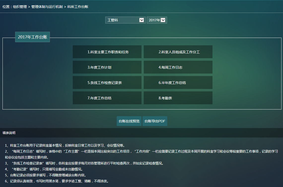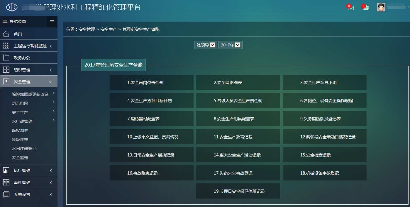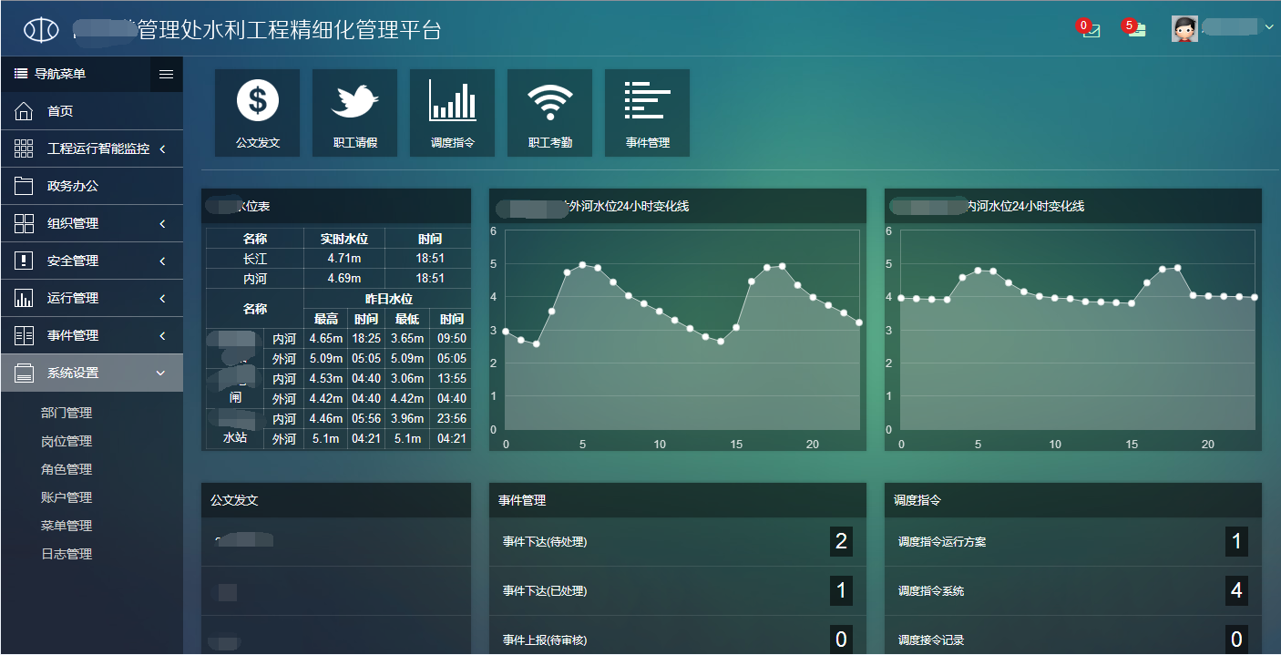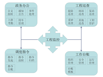針對(duì)水利工程運(yùn)行單位的日常業(yè)務(wù),將工程管理工作進(jìn)行精細(xì)化、信息化管理,建設(shè)水利工程精細(xì)化運(yùn)行管理系統(tǒng),包括政務(wù)辦公、工程檢查、調(diào)度指令、公文管理、工作臺(tái)賬以及系統(tǒng)設(shè)置五個(gè)模塊,分別對(duì)應(yīng)日常工作中不同的工作要求。